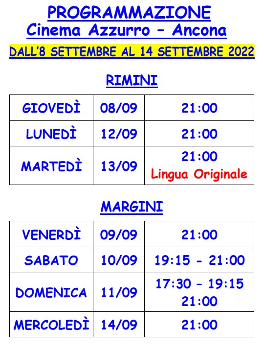 Cinema Azzurro Ancona. La programmazione dall’8 al 14 settembre