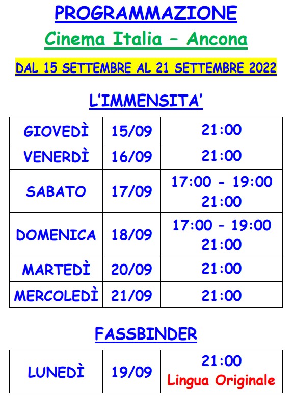 Cinema Italia di Ancona: la programmazione dal 15 al 21 settembre